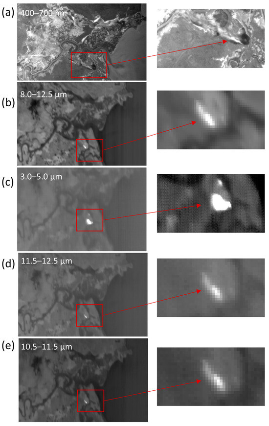 On 8 June 2024, at approximately 9:25 a.m. CST, the multispectral uncooled infrared camera detected an early-stage forest fire near the mouth of Leman Bay on the Roper River in the Northern Territory of Australia. Both the panchromatic VIS and TIR imaging systems had successfully captured the scene of the wildfire. The visible light image (as shown in Figure 9a) provided clear surface information about the area, indicating that the forest fire was in its early stages, accompanied by visible smoke and signs of fire. Figure 9b–e shows the grayscale data images of the four bands from the TIR imaging system, enabling a precise identification of the wildfire’s location. When combined with the known spatial resolution information, geographic information may be matched to locate the specific location of the wildfire, with geographic coordinates of (135.34°E, 14.77°S), more accurately.