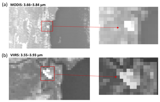 MODIS and VIIRS remote sensing images were selected for comparison. The image time of the MODIS data was 05:45 UTC on 8 June 2024, and the remote sensing image of the thermal infrared band band20 (3.66–3.84 μm) channel was selected (as shown in Figure 10a). The imaging time of the VIIRS data was 05:24 UTC on 8 June 2024, and the remote sensing image of the thermal infrared band I04 (3.55–3.93 μm) channel was selected (as shown in Figure 10b).