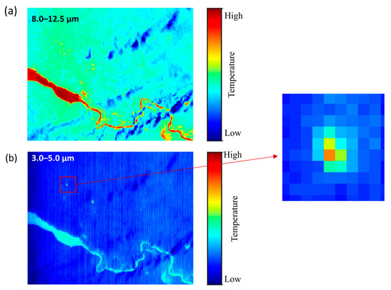 The heatmaps of fire spot remote sensing images from two TIR bands of the camera. (a) The heatmap for fire spot detection in the 8.0–12.5 μm band. (b) The heatmap for fire spot detection in the 3.0–5.0 μm band.
