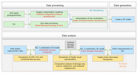 To evaluate the quantitative metrics for the reinforcement performance of the anchor method installed on slopes, this study implemented a 3D numerical model twice on a slope with an artificially constructed anchor (10 places) using UAS image filming, structure-from-motion (SfM)-based image analysis, and a combination analysis of TLS’s point cloud data. In the first implementation, images were recorded at 4 K resolution. In the second implementation, after artificially inducing damage, 3D modeling was performed with 8 K resolution to derive damage factors such as adhesion, displacement, and failure of the slope anchor head. In particular, to examine the crack reproducibility of the 3D model by resolution, the data were configured as 4 K and 8 K, respectively. Additionally, laser scanning using TLS was performed. The study first validated the accuracy and reproduction of the constructed 3D numerical model. It then analyzed the damage factor of the slope anchor, focusing on cracks, by comparing the measured crack width. Failure and adhesion with the ground were assessed by detecting quantitative numerical data in the 3D model, and error differences in crack width were analyzed by distinguishing between 4 K and 8 K UAS image resolutions. For anchor head failure, the percentage of failures was analyzed by detecting the area and volume of the failure. Rotation angle and displacement were measured when the head caused rotational displacement. The ground settlement was assessed by measuring the adhesion of the anchor head, and a comparative analysis was conducted to determine the maximum depth of settlement in the numerical model based on a combination of UAS and terrestrial LiDAR analysis. Finally, the study examined the potential for utilizing the extracted damage factors from the 3D numerical model for maintenance purposes. Figure 1 shows the process of this study.