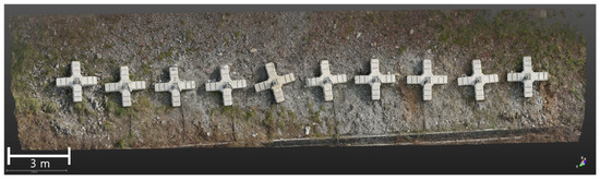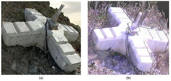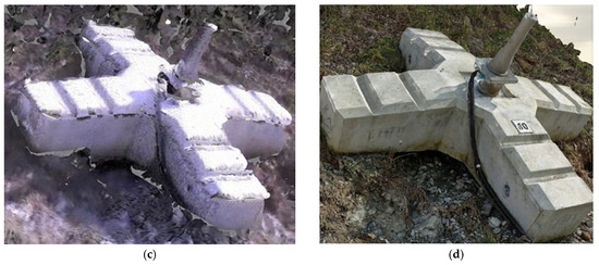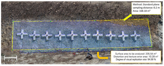 Figure 10a illustrates the blind spots on the upper surface of the anchor observed during laser scanning with TLS. These blind spots have been addressed and supplemented with UAS images for the respective area (Figure 10b). The reproduction, which addresses the limitations of blind spots inherent in each data-collection method, is confirmed by the results shown in Figure 11. These confirm the effectiveness of 3D precision analysis based on combined analysis. During the reproduction analysis, the analyzed area was defined to exclude regions in the reproduced 3D numerical model where surface treatment was not feasible, such as vegetation, wires, and cables. Reproduction verification involved the calculation of the area ratio of regions with shape distortion or average resolution below the texture expression level compared with the analyzed target area. The analyzed surface area (totaling 205.54 m²) included the total area of 10 anchors and the ground surface. The areas with distortion and texture errors amounted to 10.28 m² and resulted in a reproduction accuracy of 94.99%.