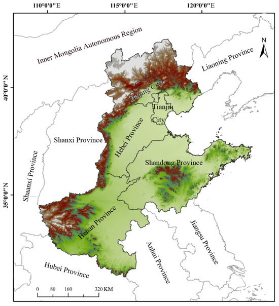 The region is bounded by the Taihang Mountains to the west, the Yellow and Bohai Seas to the east, and the Yanshan Mountains to the north, and it extends to the Dabie Mountains in the southwest and northern Jiangsu and Anhui provinces in the southeast. The study area encompasses the plain regions of five provinces and municipalities (Beijing, Tianjin, Hebei, Shandong, and Henan), accounting for approximately one-fifth of China’s total arable land and serving as a crucial national grain production base [29].