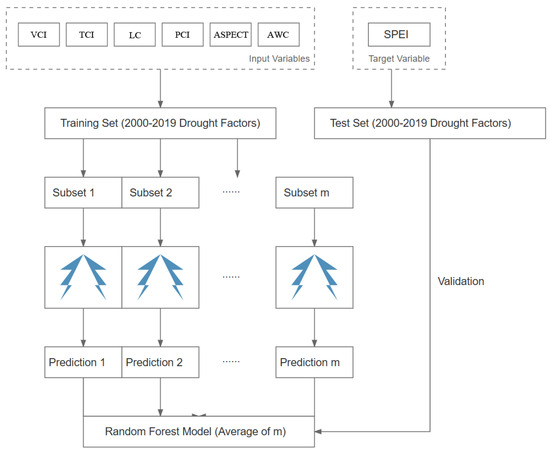 Technical framework of the integrated drought monitoring model based on multi-source remote sensing data and random forest algorithm.