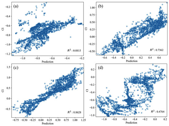 Scatter diagram of correlation between model simulation value and CI value: (a) spring season; (b) summer season; (c) autumn season; and (d) winter season.