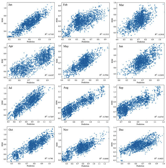 Soil moisture levels directly influence crop growth conditions and serve as a crucial factor in agricultural drought assessment [44]. To validate the comprehensive drought index’s assessment capability, we employed the relative soil moisture (RSM) dataset for cross-validation of the Comprehensive Integrated Drought Index (CIDI). Considering the decreasing accuracy of soil moisture data with increasing depth, we selected soil moisture data at 20 cm depth for validation. The soil moisture dataset was obtained from CMADS covering 12 months in 2012. After cropping and resampling the relative soil moisture data, we extracted soil moisture values corresponding to 5000 simulation points and conducted correlation analysis, with results shown in Figure 6.