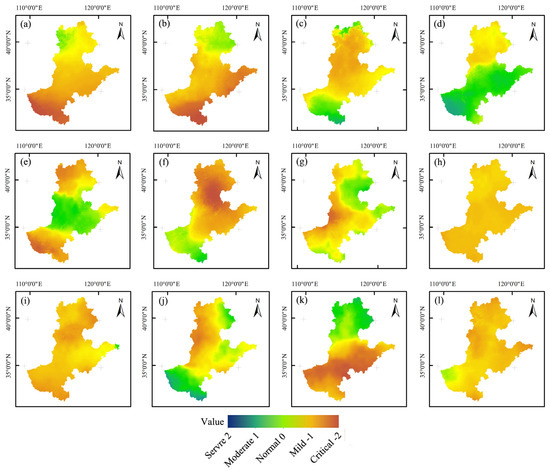 Spatially, high-frequency drought zones were mainly concentrated in south-central Shandong, eastern Henan, and northern Hebei regions. The south-central Shandong and eastern Henan regions exhibited peak drought frequency in summer, reaching 12–15 months, closely associated with high precipitation variability and intense evaporation. Northern Hebei, influenced by the Taihang and Yanshan Mountains, demonstrated consistently high drought frequency throughout the year, particularly in winter when drought frequency reached 6–12 months, primarily due to topographic blocking of moisture transport. Regarding seasonal variations, spring showed the lowest overall drought frequency, though northern Hebei and southern Henan maintained localized high-frequency zones with 9–12 drought months. Summer emerged as the most severe drought season, especially in south-central Shandong and eastern Henan, coinciding with high temperatures and peak crop water demands. Autumn showed moderated drought frequency, though southern Shandong, northern Hebei, and central Henan maintained relatively high levels of 9–12 months. Winter drought primarily concentrated in northern Hebei, southwestern Shandong, and northern Henan, with frequencies generally ranging between 6–12 months.