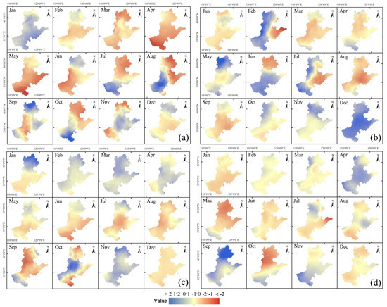 Seasonal analysis revealed significant spatiotemporal heterogeneity in drought patterns across the study region (Figure 9). Spring (March–May) exhibited the lowest drought frequency, primarily influenced by frequent convergence of cold and warm air masses during the winter-spring transition period. However, localized high-frequency zones emerged in specific geographic locations: northern Hebei experienced reduced precipitation due to frequent cold air activities influenced by the orographic lifting effect of the Yanshan Mountains, while southern Henan formed a drought-prone area due to blocked northward warm-moist airflow, with maximum frequency reaching 9–12 months.