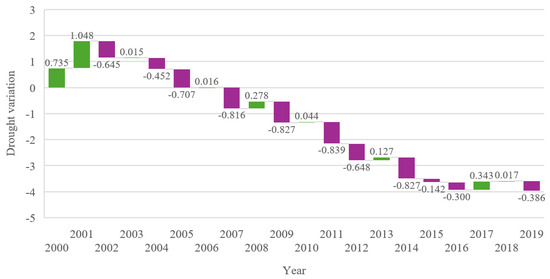 Variation in drought over a 20-year period. The legend indicates green for an increase in drought, purple for a decrease, and blue for the summary of all changes.