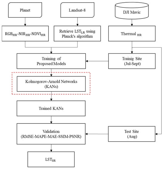 First, THR images were collected using the DJI Mavic 3 Thermal drone. These images, with a spatial resolution of 23 cm, were acquired in July, August, and September 2024 to coincide with Landsat-8 satellite passes over the study area. This synchronization between drone and satellite data ensures that the images were acquired under similar environmental conditions. Simultaneously, IHR images were collected from the Planet satellite. These IHR were used to transfer spatial information from the optical images to the LSTLR. The transfer was performed either simultaneously with the drone data or with a time difference of one or two days to minimize significant changes in vegetation cover during the observation period. The THR images were first calibrated using the DJI Thermal SDK. A thermal ortho-photo was then generated using Agisoft software (v2.0.1). Additionally, LSTLR images were extracted from Landsat-8 using the Planck algorithm [40]. Spectral bands and the Normalized Difference Vegetation Index (NDVI) were extracted from the IHR images, and for accurate alignment, all features were resampled to a resolution of 3 m using the nearest neighbor method. An affine transformation was applied to ensure accurate geographic positioning. Finally, the KAN model was trained using data from training sites and tested on a test site to assess its accuracy and effectiveness in generating LSTSR. A detailed exposition of the KAN model and comparison models is provided in Section 2.3.1 and Section 2.3.2.