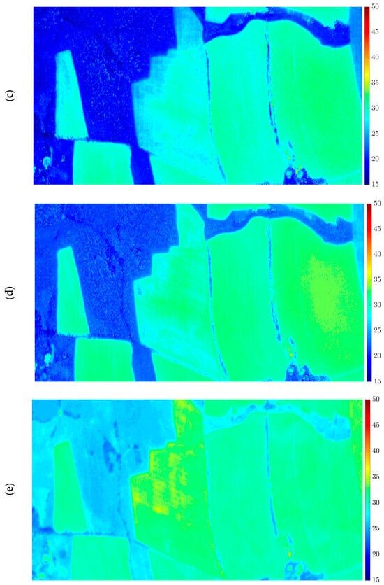 The significant difference in thermal image quality between drones and satellite-based platforms such as Landsat 8 further highlights the importance of high spatial resolution. Drone-based thermal imagery provides more detailed, higher-resolution data, allowing for better temperature measurements due to superior sensor accuracy and sensitivity. Drones operate at lower altitudes and capture images under favorable atmospheric conditions, reducing the impact of clouds and other weather factors that can affect satellite imagery. In contrast, Landsat 8 provides broader coverage at a lower spatial resolution (30 m), which results in a loss of detail. As a result, drone-derived LST data tend to be more accurate, as evidenced by studies showing a higher coefficient of determination (R2) between drone LST data and field measurements (0.89) compared to Landsat 8 (0.70) [61]. Higher resolution data, especially from drones, enable more accurate and localized temperature mapping, which is critical for urban planners looking to identify areas vulnerable to heat stress, or farmers looking to optimize irrigation practices. The enhanced detail allows for more tailored interventions and more effective policy strategies.