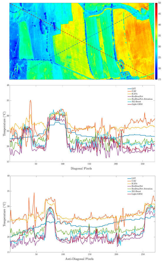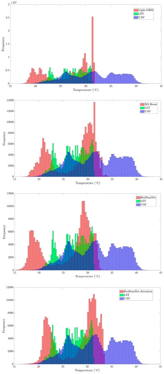 Space-borne RS data, while providing comprehensive spatial coverage, are often hindered by factors such as atmospheric interference, variations in surface emissivity, and topographic effects, which can significantly compromise data accuracy and resolution [35]. These limitations pose substantial challenges for applications requiring high-precision LST mapping, particularly in heterogeneous landscapes where fine-scale thermal variations are critical. In contrast, Unmanned Aerial Vehicles (UAVs) offer high-resolution, localized data acquisition, making them particularly useful for site-specific analyses [36]. This capability is especially advantageous for capturing fine-scale temperature variations in urban and heterogeneous landscapes, where microclimatic conditions vary significantly. Nevertheless, the relatively limited spatial coverage of UAVs compared to satellite-based observations restricts their effectiveness in large-scale LST monitoring, and these valuable data are rarely utilized in the literature for LST data production.
