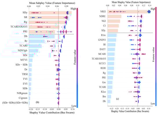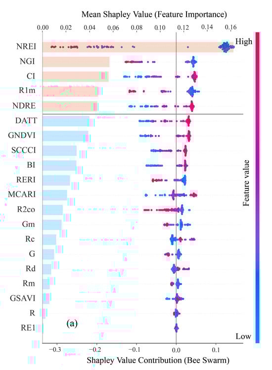 - Feature exaction: using Python 3.6.1, spectral and textural indices were batch-extracted from the regions of interest (ROIs). These included the mean reflectance of the 6 spectral bands, along with 24 MVIs (Table S1) and 48 MTIs. The MTIs were derived by combing the 8 GLCM-based texture parameters with the 6 spectral bands, resulting in texture indices such as Bm (mean texture of the blue), R1c (contrast texture of the red edge 1), and Nco (correlation texture of the near-infrared), among others.
