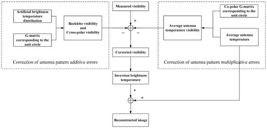 The in-orbit calibration of FPASR mainly involves injecting correlated and uncorrelated noise signals into the receiver channels. It relies on the response to a known signal to correct for various errors, mainly errors in the receiver channels. However, it is important to note that this correction mechanism does not include the antenna; consequently, the errors related to the antenna pattern still cannot be solved by noisy signal injection. Multiplicative errors and additive errors are difficult to correct by a single correction method, so a two-step correction method is required to correct the antenna pattern errors. Initially, corrections are applied to backlobe contributions and cross-polar contributions utilizing an artificial BT distribution. Subsequently, differential processing of the visibility function is conducted to mitigate the amplification factor attributed to antenna pattern errors. The flowchart illustrating this correction process for antenna pattern errors is presented in Figure 1.