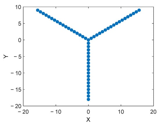 In order to analyze the antenna pattern error, an end-to-end simulator for FPASR has been developed. The antenna array is a Y-shaped array of 55 elements, with 18 elements in one arm. The position of each antenna element in the array is illustrated in Figure 2. The ideal normalized co-polar and cross-polar antenna patterns are depicted in Figure 3. The antenna patterns for both polarizations are similar. A Fresnel model of the ocean has been employed as the observation scene for simulation. Figure 4 shows the four expected polarimetric BTs: . and are the third and fourth Stokes parameters, defined as , . The BT error is computed within a circle . The calculation of is as follows: