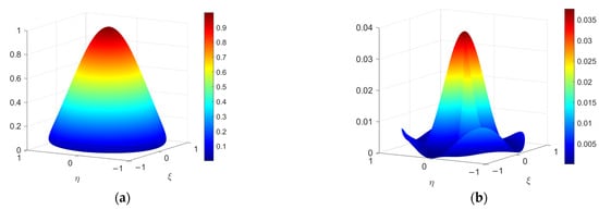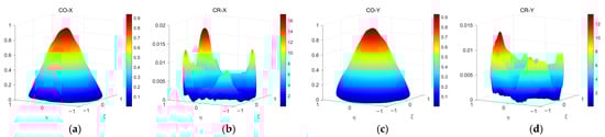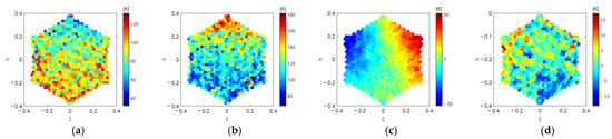 where represents the pattern of the co-polar (C) or cross-polar (X) of the antenna element k at p polarizations. represents the pattern of the co-polar (C) or cross-polar (X) of the antenna element j at q polarizations. is the conjugate of . It is essential to emphasize that the G-matrix required in Equation (16) must be computed over the complete unit circle. In cases where the cross-polar pattern is zero, the fully polarimetric G-matrix in Equation (15) has zero values except for the diagonal. However, since the cross-polar antenna pattern of a real system cannot be zero, all terms in the fully polarimetric G-matrix are nonzero. Furthermore, given that the co-polar pattern significantly exceeds the cross-polar pattern, it follows that the diagonal values of the fully polarimetric G-matrix are the largest. And . For and , are multiplied by , . Therefore, the cross-polarization has a non-negligible contribution to both and . If only the co-polar pattern is considered in the BT reconstruction, the contribution of the cross-polar pattern is equivalent to adding an additive error to the visibility function. The visibility function error caused by the cross-polar pattern is as follows: