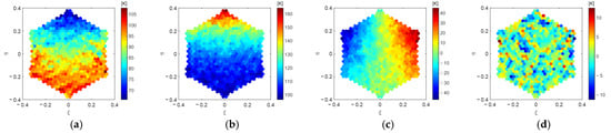 Some studies have found that the antenna pattern has an important impact on the aperture synthesis radiometer. After taking into account the coupling effect between antennas, a new formulation of the visibility function equation (called the Corbella equation) was derived in [8,9]. A. Camps et al. analyzed the impact of antenna errors on radiometric accuracy and emphasized that antenna patterns are critical and need to be calibrated [10]. Díez-García, R., et al. investigated the relationship between the reconstruction error and antenna pattern differences. They took the SMOS antenna as the reference and analyzed the influence of the pattern differences and the element spacing on the reconstruction error [11]. At present, some methods have been proposed to mitigate antenna pattern error. The flat target transformation (FTT) method proposed in reference [12] can be used to correct the antenna pattern error. This method reduces the antenna pattern error by measuring a “flat” target such as the cold sky near the galactic poles. Refs. [13,14] proposed to observe a reference stable ocean scene instead of the cold sky in [12], thereby further reducing the image errors caused by antenna pattern error. However, it is not easy to find an ideal reference target for observation, and the quality of its correction effect depends on the flat target being observed. In addition, these methods only correct part of the antenna pattern errors.