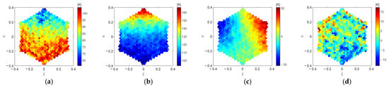 The expression of the G-matrix indicates that the input data required for its construction include the following: (1) the antenna pattern of all elements in the array; (2) the antenna position of all elements in the array; (3) the fringe-washing function. The antenna position is the reference position of the antenna phase pattern. In general, it is assumed that the antenna positions are equal to the nominal values. For wide-beam antennas of synthetic aperture radiometers, this position is typically close to the phase center of the antenna [21]. The fringe-washing function can be measured by injecting the correlated noise signals with different delay times. However, this paper uses a simpler formulation and does not consider the fringe-washing function. Antenna patterns are measured in an anechoic chamber. To mitigate the influence of the frequency dependence of the antenna voltage patterns, the weighted average of the antenna voltage pattern is adopted [22].