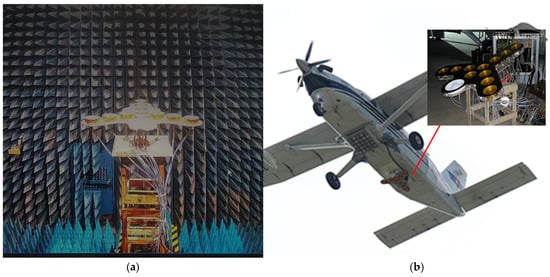 (a) Picture of antenna array in anechoic chamber. (b) Picture of the instrument mounted on the aircraft.