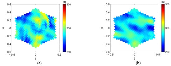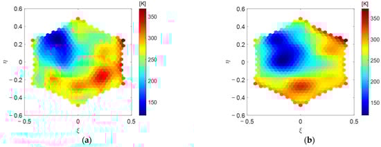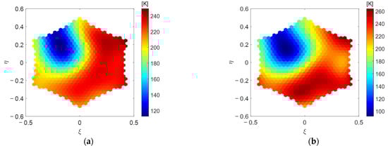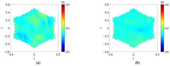 Before the flight experiment, indoor experiments were carried out in an anechoic chamber. The results of the indoor experiments were used to conduct a quantitative assessment of the effectiveness of the correction method. The absorptive material background wall of the anechoic chamber is used as the observed scene for imaging. The absorbing material’s physical temperature is measured using a temperature sensor, and it is approximately 293 K. The BT of the absorbing material is approximately equal to the physical temperature. Therefore, the original BT of the observed scene can be set as 293 K. By using Equation (27) and combining the original BT with the reconstructed BT, the BT error can be calculated. The reconstructed images are shown in Figure 10 and Figure 11. The absorptive material background wall has a uniform and stable temperature, so the reconstructed BT in the alias-free field of view is theoretically a constant value. The experimental results obtained by the two-step correction method are more consistent with expectations. Before the correction, the reconstructed BT in the alias-free field of view exhibited significant errors, with substantial variations in brightness temperature. After correction, the brightness temperature of the image became more uniform and consistent. From the results of BT errors before and after correction in Table 3, it can be seen that after the two-step correction method is applied, the error has been reduced from over 10 K to approximately 3 K.