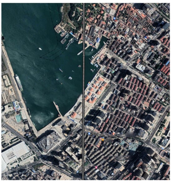 Figure 12 presents an optical image of a coastline scene, with the black line indicating the flight path of the aircraft. Its corresponding reconstructed BT image is shown in Figure 13. There is a significant contrast in BT between land and water. However, the BT image exhibits distortion. The boundary of the blue low-temperature zone in the experimental results delineates the coastline. As illustrated in Figure 11a,b, the X polarization and Y polarization reconstructed images present significantly different coastal features, and these features are all different from those depicted in the optical images. The two-step correction method described above was used to correct the measured visibility function without considering the contribution of the backlobe. After the antenna pattern correction method is applied, the corrected image results are shown in Figure 14. The image quality of the corrected image is improved and the geometry of the coastline is well preserved. In Figure 14, the distribution areas and shapes of the ocean and land are highly consistent with those of the optical image. Through imaging analysis of this area, the validity of the correction method was qualitatively verified.