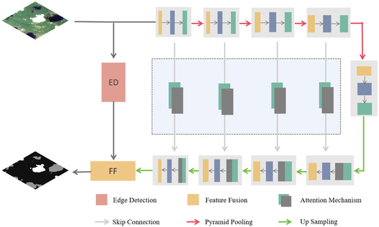 This article constructs a network structure, as shown in Figure 1, based on the Unet network architecture. The network has three parts: an edge detection sub-network (ED), an Unet semantic segmentation sub-network, and a feature fusion module.