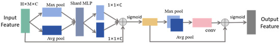 This mechanism consists of two parts—a channel attention module and a spatial attention module. The channel attention module learns and highlights the importance of each channel in feature extraction through weighted averaging processing. By using global average pooling and global max pooling (where the pooling kernel size equals the spatial dimensions of the input feature map), the spatial dimensions of the input features are compressed to 1, generating two channel descriptors. These descriptors are then fed into a shared multi-layer perceptron (MLP) for feature transformation, producing a channel attention map. Finally, the values of the attention map are normalized to the range [0, 1] via a Sigmoid function. The spatial attention module learns and emphasizes the importance of each spatial position in feature extraction through weighted averaging, effectively highlighting the target area and suppressing irrelevant information. By performing channel-wise average pooling and max pooling on the input feature map (assuming the input feature map is , which becomes after average pooling, while max pooling retains ), two spatial descriptors are obtained. These descriptors are concatenated along the channel dimension and fed into a 7 × 7 convolutional layer to generate a spatial attention map. Finally, the values of the spatial attention map are normalized to the range [0, 1] via a Sigmoid function. Through the above mechanism, the influence of noise in cloud images can be reduced, important regional features can be highlighted, and the segmentation effect of clouds and cloud shadows can be improved. The operation process of CBAM fusion attention can be defined as