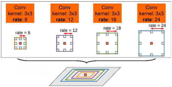 Hollow convolution [18] has always been favored by researchers in the field of segmentation as a means of effectively expanding the receptive field of ordinary convolution kernels. Its ability lies in significantly expanding the receptive field of the convolutional kernel without increasing the number of model parameters and computational complexity. As shown in Figure 4, adding intervals to a regular convolution kernel to form a dilated convolution allows the kernel to cover a larger range without changing the size or number of layers. The relationship between the convolution kernel’s range of dilated convolution and its dilation rate is shown in the Formula (8).