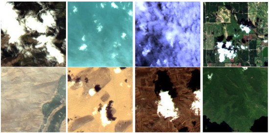 GF1_WHU (GF-1 Cloud and Cloud Shadow Coverage Verification Dataset) [19] was released by the SENSIMAGE Laboratory at Wuhan University and is widely used in cloud detection and cloud shadow segmentation tasks. This dataset includes 108 GF-1 Wide Field of View (WFV) 2A level images and their corresponding reference masks collected from May 2013 to August 2016. The corresponding ground truth masks are divided into four categories: background pixels are 0, transparent area pixels are 1, cloud shadow area pixels are 128, and cloud area pixels are 255. Each image in the dataset consists of four multispectral bands, including three visible R, G, and B bands and one near-infrared band, with a spatial resolution of 16 m. All four multispectral bands of the GF1_WHU dataset were utilized for cloud detection. The combination of multi-band information is beneficial for improving the accuracy of cloud and cloud shadow detection. As shown in Figure 8, the GF1_WHU dataset contains images of different cloud types (such as cumulus, stratus, cirrus, etc.), cloud cover, cloud shadow patterns, and different geographical environments. The data types and contents are rich and diverse, providing sufficient materials for this study.