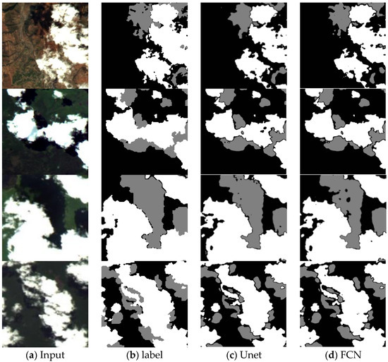 in Formulas (10)–(13) above, is the number of categories; is the class pixel and is predicted to be the number of class pixels; is the class pixel and is predicted to be the number of class pixels; is the class pixel and is predicted to be the number of class pixels; indicates that the sample is correctly divided into cloud and cloud shadow; indicates that the sample background pixel is incorrectly divided into cloud and cloud shadow; and indicates that the cloud and cloud shadow of sample are wrongly divided into background pixels.