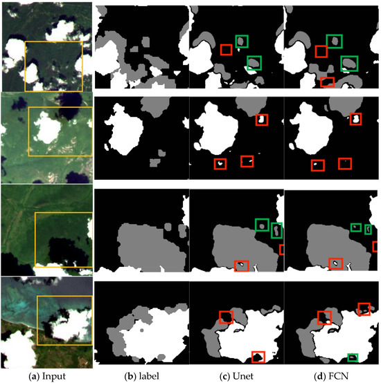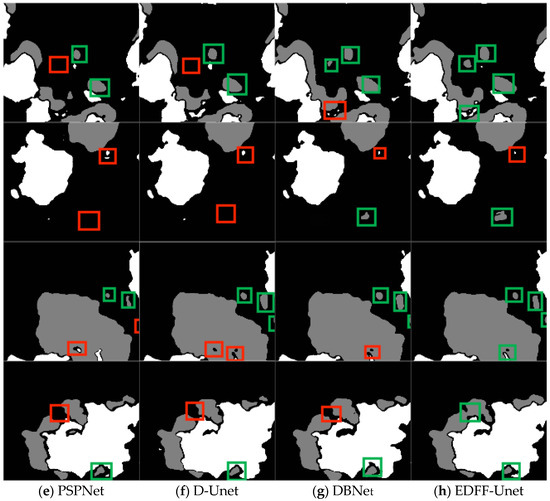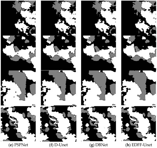 From the visualization results of the ablation experiment in Figure 9, it can be further seen that EDFF-Unet can significantly improve the segmentation performance of cloud and cloud shadow, and reduce missed detection and false detection.