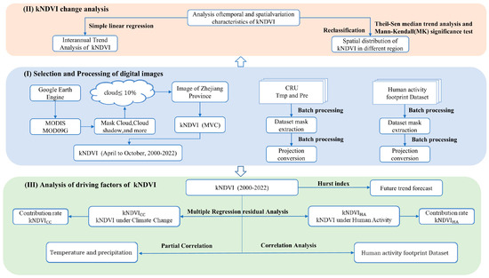 The technical approach of this study is illustrated in Figure 2; (I) kNDVI data were calculated and selected based on the MOD09GA dataset within the Google Earth Engine (GEE) system, and kNDVI, temperature, rainfall, and human footprint activity data were batch processed using ArcGIS version 10.8 software; (II) According to the kNDVI data of Zhejiang from 2000 to 2022, Sen MK analysis was employed to research the interannual and spatiotemporal change trend of vegetation in the study area; (III) The influence of climate shift and human activities on kNDVI in Zhejiang was explored using multivariate regression remainder analysis, and the potential main driving factors affecting kNDVI changes in Zhejiang Province were analyzed under the climate change background using correlation analysis and partial correlation analysis.
