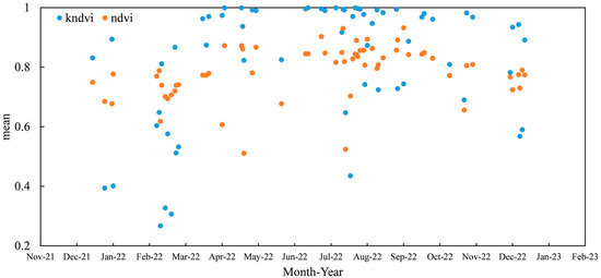 The Normalized Difference Vegetation Index (NDVI) is one of the most commonly used vegetation indices. It has achieved certain results in the study of spatiotemporal changes in vegetation coverage in China and globally, and has been widely used in related field research on vegetation coverage monitoring [28,29]. However, NDVI exhibits low sensitivity and lacks response to photosynthesis in high-density regions, demonstrating a saturation phenomenon that impacts the accuracy of vegetation change detection [30,31]. Camps-Valls et al. [32], 2021, proposed the kNDVI based on the principles of artificial intelligence learning and kernel method theory and compared its performance with NDVI and Near-Infrared Reflectance vegetation (NIRv). They believed that kNDVI outperformed NDVI in terms of biological communities, climate zones, and phenological cycles. Compared to traditional vegetation indices, kNDVI demonstrates higher stability and robustness, with a greater ability to accurately capture vegetation growth changes and extract vegetation information, thereby providing a valuable precise reflection of plant condition [33]. Numerous researches confirmed that kNDVI is superior in representing vegetation changes in natural ecosystems [34,35].