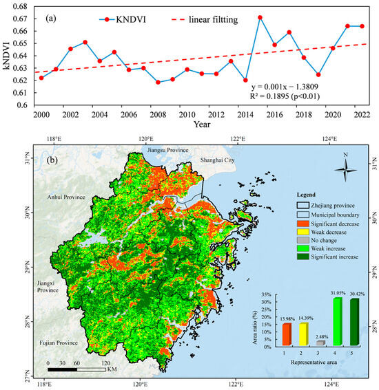 This study used kNDVI as an indicator to monitor long-term vegetation coverage changes in Zhejiang Province and examined the impacts of climate change and human activities on vegetation coverage changes in Zhejiang Province and their driving factors. The results showed that: