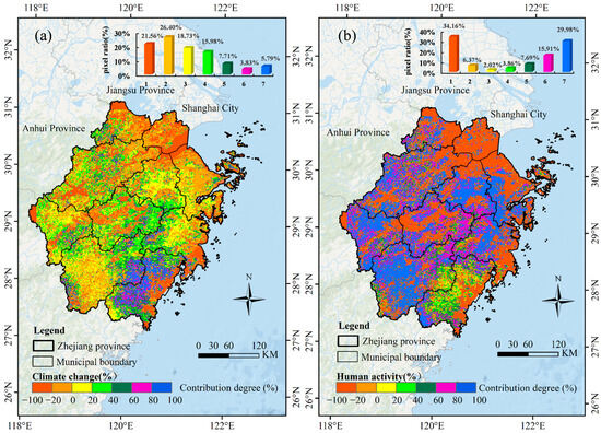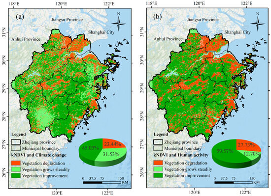 Spatial distribution of the relative contributions of climate change and human actions to kNDVI in Zhejiang. (a) The relative contribution of climate change to kNDVI. (b) That of human activities to kNDVI.