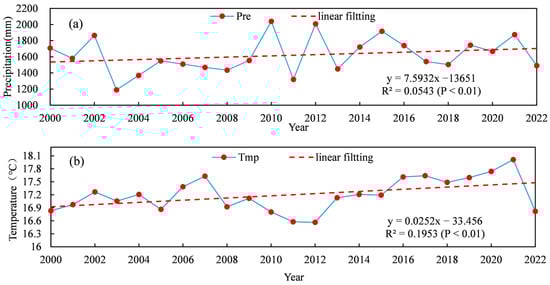 Rainfall and temperature changes in Zhejiang from 2000 to 2022. (a) Rainfall variation trend in Zhejiang from 2000 to 2022. (b) Temperature variation trend in Zhejiang from 2000 to 2022.