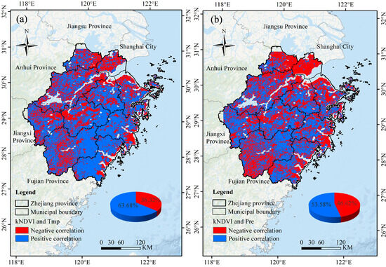 Analysis reveals that the partial correlation parameter of kNDVI with temperature is 0.44, and the proportion of positive correlation with temperature is 63.68%, which is predominantly located in the southwest of Shaoxing, the eastern regions of Jinhua, Lishui, Wenzhou, and the northeast of Taizhou (Figure 9a). Similarly, the partial correlation parameter with precipitation is 0.056, and the proportion of positive correlation with precipitation is 53.58%, which is primarily situated in the mountainous and hilly areas of the west of Quzhou, Jinhua, and the northeast of Lishui (Figure 9b).