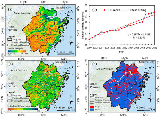 Correlation between spatiotemporal changes in human activity footprints and kNDVI. (a) Spatial distribution of anthropogenic activity footprints; (b) Change trend of human activity footprint from 2000 to 2022; (c) Correlation between anthropogenic activity and kNDVI; (d) anthropogenic activity footprint and kNDVI importance.