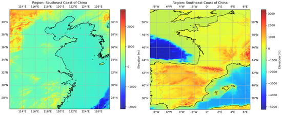 The experiment was conducted based on the ERA5 reanalysis dataset [48]. ERA5 is a fifth-generation global climate reanalysis dataset provided by the European Centre for Medium-Range Weather Forecasts (ECMWF), which assimilates remote sensing data into NWP models to provide the most accurate meteorological and climate information possible. It is a public dataset based on the vertical coordinates of the pressure measured in hPa and includes two-dimensional fields that provide latitude and longitude values for each location. The experiment was mainly carried out in the southeast coastal area of China, and the scope was 26.25°N~42°N, 112°E~127.75°E. At the same time, the area 36.25°N~52°N, 9°W~6.75°E was used for transferability testing. Due to the significant spatiotemporal variation, the 2 m temperature (T2M), surface pressure (SP), and specific humidity at 1000 hPa (SH1000) were selected as the experimental variables. In addition, total precipitation (TP) was introduced as a supplementary experimental variable to test the model’s performance in the discontinuous spatiotemporal field. In order to apply the dataset to supervised learning, the sliding window technique was adopted. A 37 h time window and a 10 h sliding time step were used for sampling. Then, about 3500 samples obtained from sliding window processing were processed at 2 h and 6 h intervals to generate low-frame-rate data as input to the neural network. The experiment was conducted based on data from 2020 to 2023 by dividing the dataset in a 3:1:1 ratio for training, validation, and testing. The training set was used for model training; the validation set was used for model tuning and performance monitoring and did not participate in model training but was used to monitor the model’s performance on non-training data; and the test set was used to simulate the model’s encounter with new data in a real environment to finally evaluate the model’s performance. Each sample in each dataset was derived from ERA5 data, and each sample consisted of low-frame-rate data and high-frame-rate data, with the former as input and the latter as the label (ground truth). At the same time, the data were 2X downsampled to reduce the calculation cost, and the space size of the processed data was 32*32. It should be noted that in order to make the weight update more stable and improve algorithm convergence efficiency, we standardized the data with the Z-score. In addition, we introduced data from 2018 to 2019 as auxiliary data to assess the impact of changes in the training data on model performance. The training set, validation set, and test set contained the same types of meteorological variables, geographical location, and terrain characteristics as the experiment area shown in Figure 1.