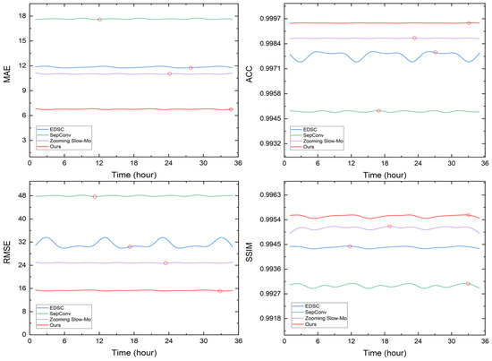 Ensuring stable generation errors over time, a property referred to as “temporal robustness”, is essential in the temporal downscaling of meteorological data. To evaluate this, we conducted a comparative analysis of different models applied to a composite meteorological field, as illustrated in Figure 4. Note that due to the nature of time downscaling, the error values corresponding to even moments in the figure have no practical significance. Our study assessed the variation in errors across different time points using key evaluation metrics, including the MAE, RMSE, ACC, and SSIM. Deep learning-based models generally show strong time robustness, but their error fluctuations differ over time. Among the models evaluated, our approach achieves significant performance improvements. Compared to the baseline methods, our model significantly reduced the MAE and RMSE while consistently attaining higher ACC and SSIM scores. The fluctuations in the MAE and RMSE remain minimal, indicating superior stability. Specifically, the ACC fluctuation range is nearly negligible, reflecting strong consistency over time. These findings suggest that our model not only achieves higher overall accuracy but also ensures better consistency across different time points, making it highly effective for the temporal downscaling of meteorological data.