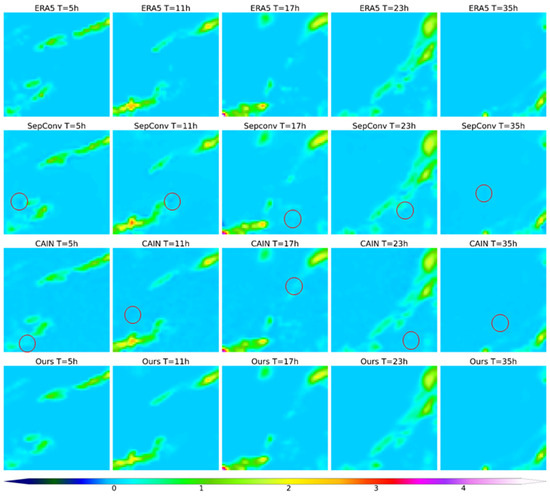 To explore the performance of the model in the discontinuous spatiotemporal field, we selected total precipitation (TP) as a new experimental variable. Given the stable performance of EDSC and SepConv, we included them as representative deep learning models for visual comparison. Figure 6 visualizes the TP fields from the ERA5 dataset and the outputs of various models. In the visualization results, the ERA5 dataset serves as the ground truth for precipitation distribution. However, compared to ERA5, existing methods exhibit noticeable issues at different times, such as the blurring of precipitation regions, distortion of boundaries, and loss of details. Particularly in marked regions, the CAIN and SepConv fail to effectively preserve the structural integrity of precipitation patterns. In particular, the CAIN produces a large number of false details in some areas. In contrast, our method accurately captures the temporal evolution of precipitation, producing results that closely resemble the ERA5 data. This indicates that our approach maintains better temporal consistency and structural fidelity. Table 8 shows the results of the quantitative evaluation, in which our approach achieved the best performance across all metrics. Specifically, it achieves the lowest error values, demonstrating superior prediction accuracy and reduced errors compared to other methods. Additionally, it attains the highest values for the PSNR and SSIM, indicating that our method best preserves the original data quality and structural information. Furthermore, our approach achieves the highest ACC among all tested methods, further verifying its stability and reliability. Overall, our method effectively reduces prediction errors and can still effectively restore the spatial structure and temporal evolution of variables in the time downscaling task of discontinuous fields represented by total precipitation. This further validates the scalability of the proposed method and makes it a more reliable solution for high-precision time downscaling.