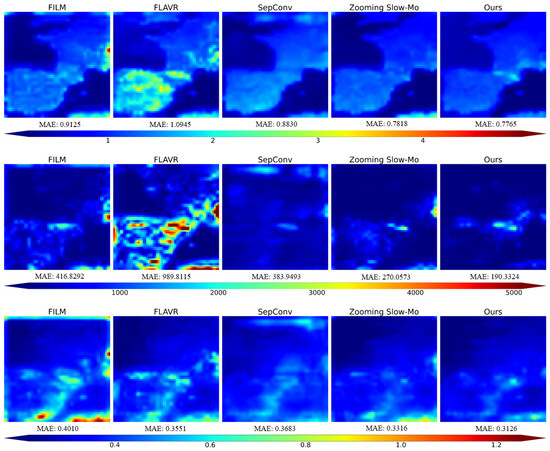 To explore the scalability, the performance of the model was tested in the 6 h interval meteorological field. Table 7 evaluates the performance in the task, using the MAE, RMSE, and ACC as evaluation metrics. The results indicate that deep learning methods generally outperform traditional interpolation methods (such as Cubic), though there are still significant differences in performance among different models. For all evaluation metrics across the three variables, the T2M (temperature), SP (surface pressure), and SH1000 (specific humidity), our method achieves the best results in the MAE, RMSE, and ACC, demonstrating superior time downscaling capabilities compared to other approaches. Specifically, compared with other deep learning methods, our approach achieves a significant reduction in the MAE and RMSE, while the ACC values reach 0.9973, 0.9983, and 0.9977, indicating higher prediction accuracy and data consistency. For instance, in the SP (surface pressure) prediction task, our method reduces the MAE and RMSE by 5.18% and 2.93%, respectively, compared to FLAVR, and by 62.06% and 63.67%, respectively, compared to EDSC. These results indicate that, in the face of downscaling tasks with varying time intervals, our method not only significantly outperforms existing models in overall accuracy but also exhibits strong scalability.