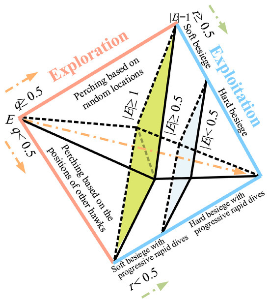The HHO algorithm was developed by Heidari et al. in 2019, which is inspired by the cooperative behavior and hunting process of Harris’s hawks in nature [54]. The evolution of the population within this algorithm is achieved by mathematical modeling of various predation strategies. There are mainly three stages in the HHO algorithm: exploration, the transition from exploration to exploitation, and exploitation. In the subsequent sections, we will mathematically model the exploratory and exploitative phases of the HHO algorithm according to the Harris’s hawks’ techniques of exploring a prey, executing a surprise pounce, and employing diverse attacking strategies. Figure 1 displays all the phases for HHO.