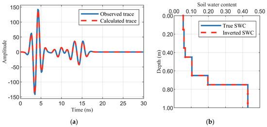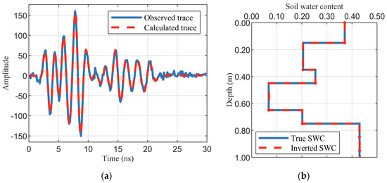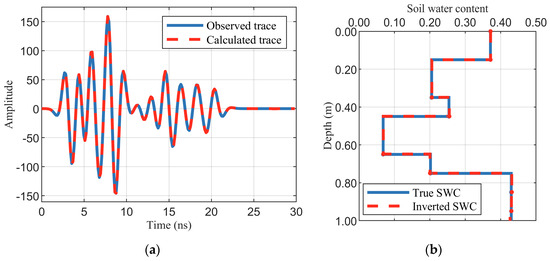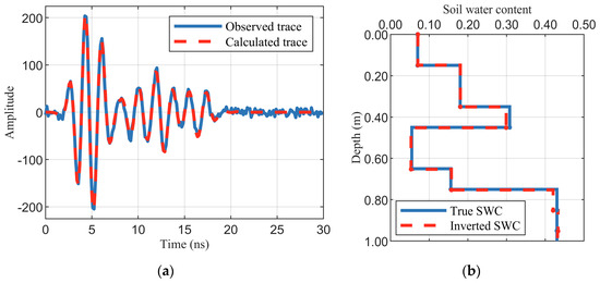 Inversion results of data without noise for Model A: (a) observed GPR trace (blue solid line) and calculated GPR response (red dashed line); (b) true SWC (blue solid line) and inverted SWC (red dashed line).