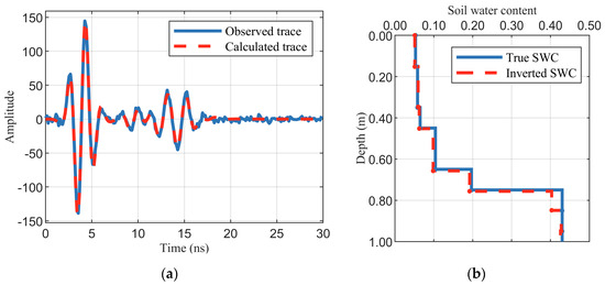 Inversion results of data without noise for Model C: (a) observed GPR trace (blue solid line) and calculated GPR response (red dashed line); (b) true SWC (blue solid line) and inverted SWC (red dashed line).
