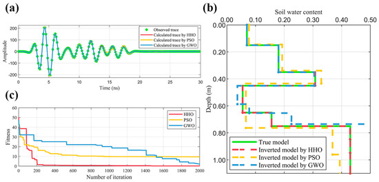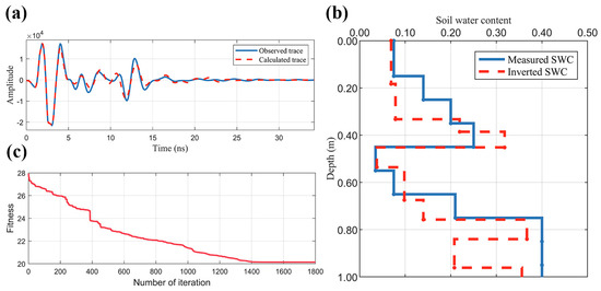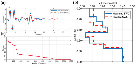 The inversion results of field data for 700th trace: (a) observed trace (blue solid line) and calculated trace (red dashed line); (b) measured SWC with Sentek (blue solid line) and inverted SWC (red dashed line); (c) fitness behavior of iteration.