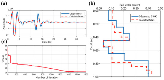 The inversion results of field data for 750th trace: (a) observed trace (blue solid line) and calculated trace (red dashed line); (b) measured SWC with Sentek (blue solid line) and inverted SWC (red dashed line); (c) fitness behavior of iteration.