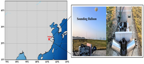 This study utilizes observational data from the ASSIST and a radiosonde deployed at the Anqing sounding station (30.623°N, 116.967°E) in Anhui to assess the accuracy of the retrieval algorithm. The data (collected 2–6 November 2024) of ASSIST under clear-sky conditions were applied to retrieve atmospheric temperature and humidity profiles. Simultaneously observed radiosonde data served as the true profiles. The location of the instrument is shown in Figure 1.