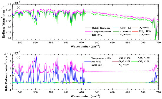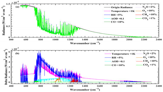 Simulated radiance and the radiance changes resulting from variations in a single element within the 525–2300 band. (a) represents the original and changed spectral radiance. (b) represents the differences in spectral radiance.