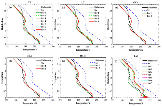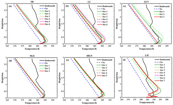 Results of temperature profile retrieval using different methods at 07:15 Beijing Time on 3 November 2024. in the figure represents the prior temperature profile, derived from the US1976 standard atmospheric model data interpolated to the retrieval height. Similarly, the iteration number represents the iteration at which the retrieval converges. The black line represents the true profile, while the red line represents the profile when the retrieval has converged. (a–f) represent the results using FR, LC, GCV, MLE, IRGN, and LM methods, respectively.