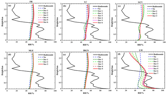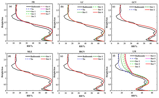 Results of humidity profile retrieval using different methods at 07:15 Beijing Time on 3 November 2024. in the figure represents the prior humidity profile, derived from the US1976 standard atmospheric model data interpolated to the retrieval height. Similarly, the iteration number represents the iteration at which the retrieval converges. The black line represents the true profile, while the red line represents the profile when the retrieval has converged. (a–f) represent the results using FR, LC, GCV, MLE, IRGN, and LM methods, respectively.